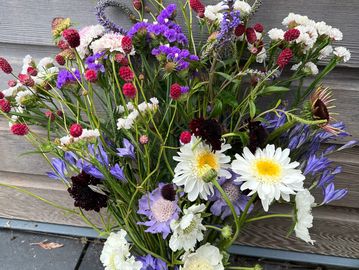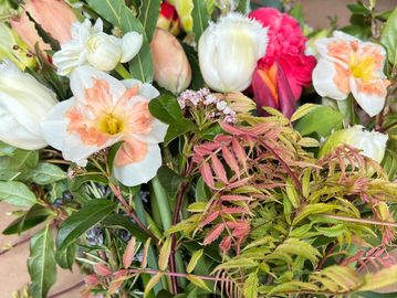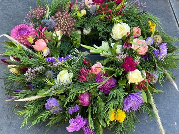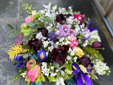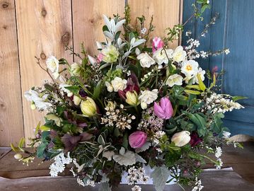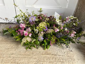 As with all my arrangements, all the foliage and flowers used in your arrangements are grown here on the flower farm and are cut specifically to order. Flower choice and colours will reflect the season, and will be selected based on our conversation about your loved one, incorporating any special requests possible. Where possible I also use moss from the farm.