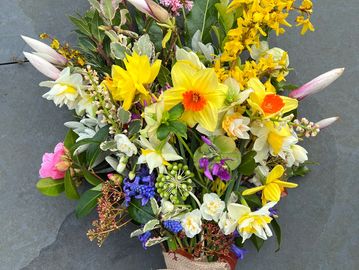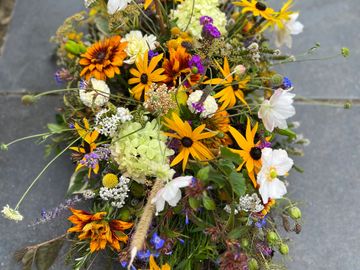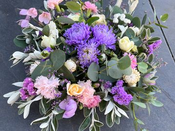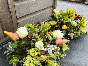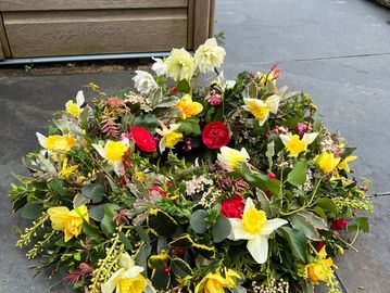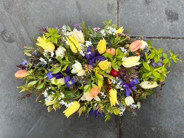 A flat loose tied arrangement of flowers and foliage for placing on a coffin. Stems can be tied with moss and hessian to prolong flower life.